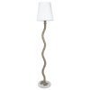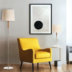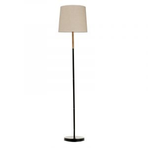 Επιδαπέδιο φωτιστικό από μαύρο μέταλλο με διακριτική ύπαρξη ξύλου στο πάνω μέρος του. Το υφασμάτινο καπέλο στην μπεζ απόχρωση δίνει ένα ρομαντικό ύφος και στο φωτιστικό και στον χώρο τοποθέτησής του.