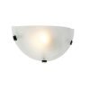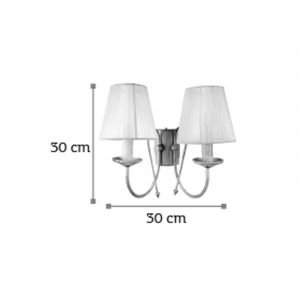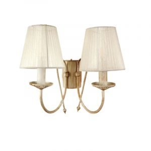 Πρόκειται για ένα μεταλλικό επιτοίχιο φωτιστικό σε απόχρωση μπεζ πατίνας. Τη λιτή σχεδίαση συμπληρώνουν τα υφασμάτινα λευκά καπέλα από οργάντζα που καλύπτουν τους δύο λαμπτήρες