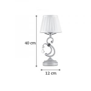 Πρόκειται για ένα μπεζ μεταλλικό επιτραπέζιο φωτιστικό με διακριτική ύπαρξη κρυστάλλων. Το μπεζ υφασμάτινο καπέλο δίνει έναν απαλό φωτισμό στον χώρο.