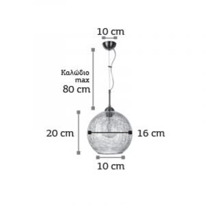 Πρόκειται για ένα κρεμαστό φωτιστικό αποτελούμενο από μπλε κρακελέ γυαλί και νίκελ ματ ανάρτηση. Το γυαλί είναι ανοιχτό στο κάτω μέρος του και το συνολικό του ύψος ρυθμίζεται στον κάθε χώρο.