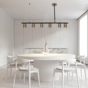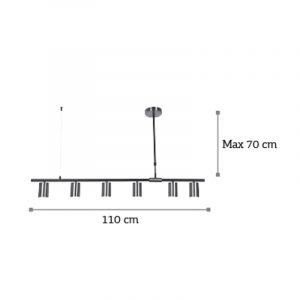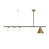 Πρόκειται για ένα φωτιστικό οροφής σε μίνιμαλ σχεδίασης. Συνδυάζει το χρυσαφί και το μαύρο μέταλλο. Τα χρυσαφί μεταλλικά καπάκια καλύπτουν τον λαμπτήρα. Η ανάρτησή του είναι ρυθμιζόμενη ώστε να διακοσμεί ιδανικά κάθε εσωτερικό χώρο.